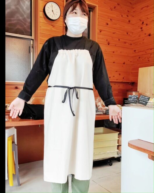 個人のお客様以外からのご依頼は初めてで試行錯誤も多かったですが、シンプルで着やすく可愛いというご要望に沿えるような店主様のサイズ感ぴったりですごくよくお似合いの素敵なエプロンに仕上がったと思います!⁂