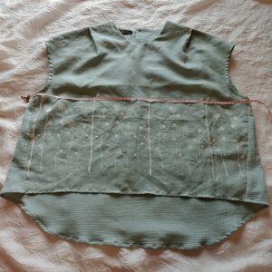 肩のタックのイメージは気に入っているのでタックを入れたまま身幅をどのように広げるかを考えた結果、前見頃のタック前後を平行に開きタック分量はそのままでそで下を少しだけ下げて作ってみたら、とても感じよく出来ました。