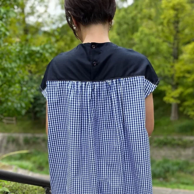 後ろ姿もギャザーたっぷりなのにすっきりシルエットです。秋冬は中にインナーたタートルなどを重ね着してもかわいいです。ほぼオールシーズン着用可能です。