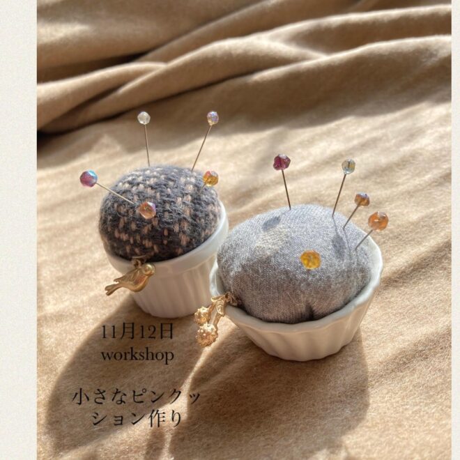 と題しましてミナペルホネンの欠片と陶器の小さな器を使ったピンクッションを制作します。