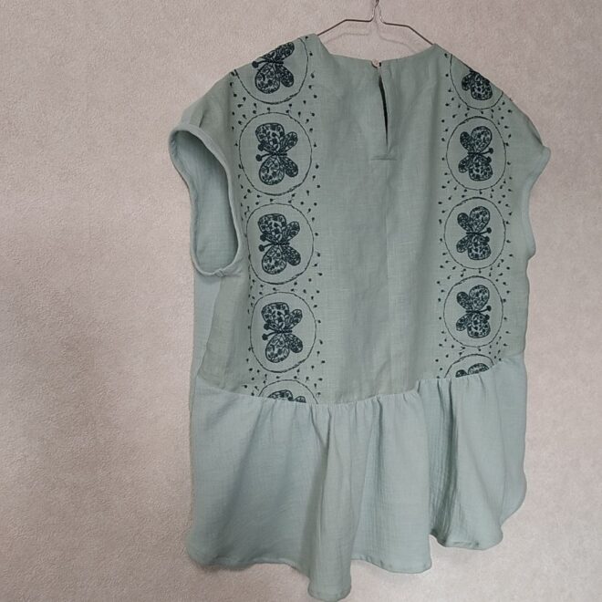 ミナペルホネンの人気テキスタイル フォレストウィングを後ろ見頃に使ったブラウスなのですが、やはり、後ろだと少し目立たないと思われているのか、なかなか、いいね♡はいただけるのですがご購入までは至らず