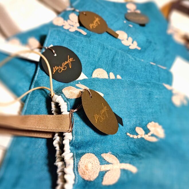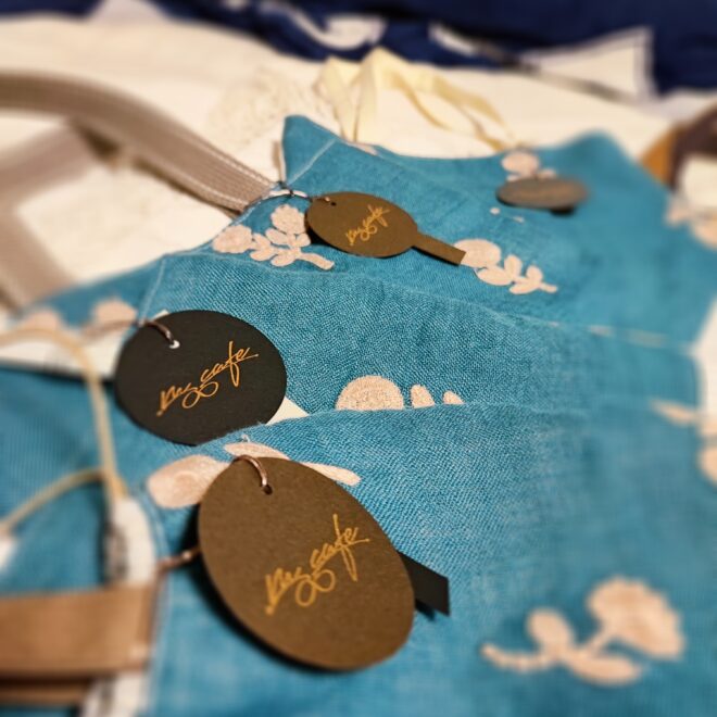 手触りがよく厚みのある紙に印刷したロゴマークが立体的にリアルな高級感を演出してくれて、まさに憧れたものがそこに産まれたような感動でした。四角い紙を丸に抜いたり、タグ付け用の穴をパンチで空けたり。そんな手作業も楽しくて、産まれてきてくれた作品を一つ一つ眺めていたらすぐに終わってしまいました☺⁂