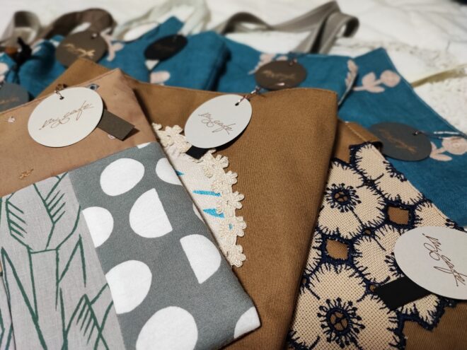 私が普段作っているのはお洋服が中心ですが、お洋服以外の部分にもたくさんの愛着を持って作っているのをこういったshopカードや小物の作品からも少しでも伝わればいいなと思っております💕