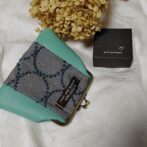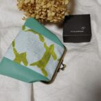 こちらは綺麗なミントグリーンの合皮レザーとミナペルホネンの小さな欠片を合わせたがま口ポーチです。